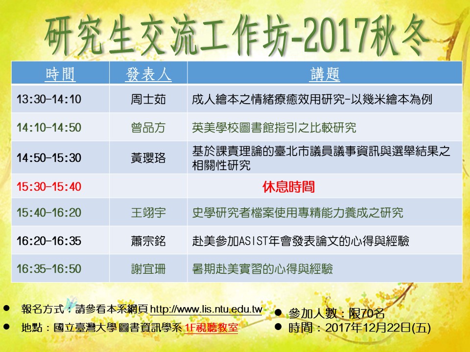 圖資系研究生交流工作坊(限圖資系所師生參加)