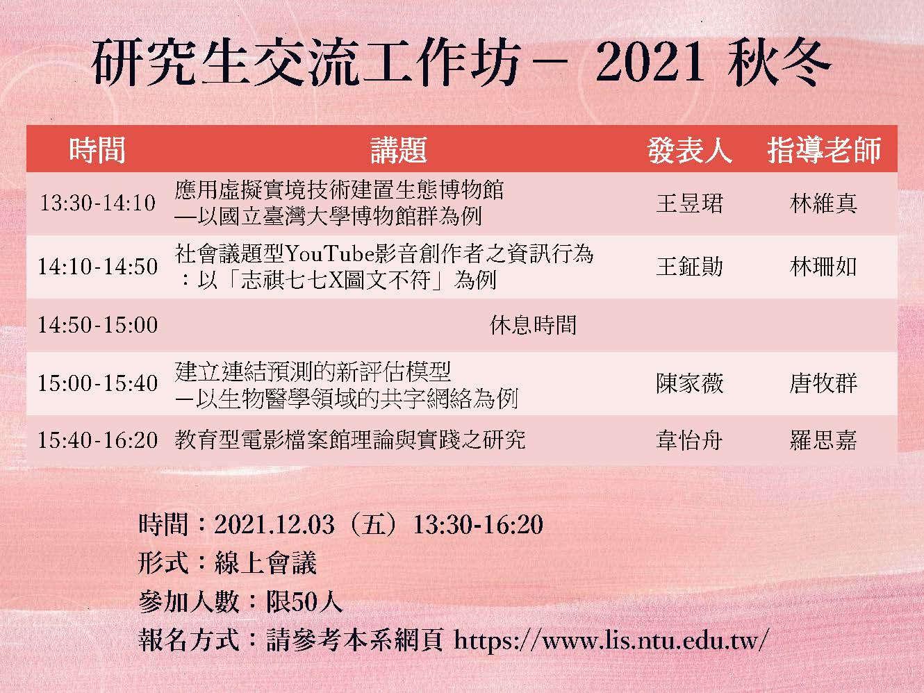 圖資系研究生交流工作坊(限圖資系所師生參加)