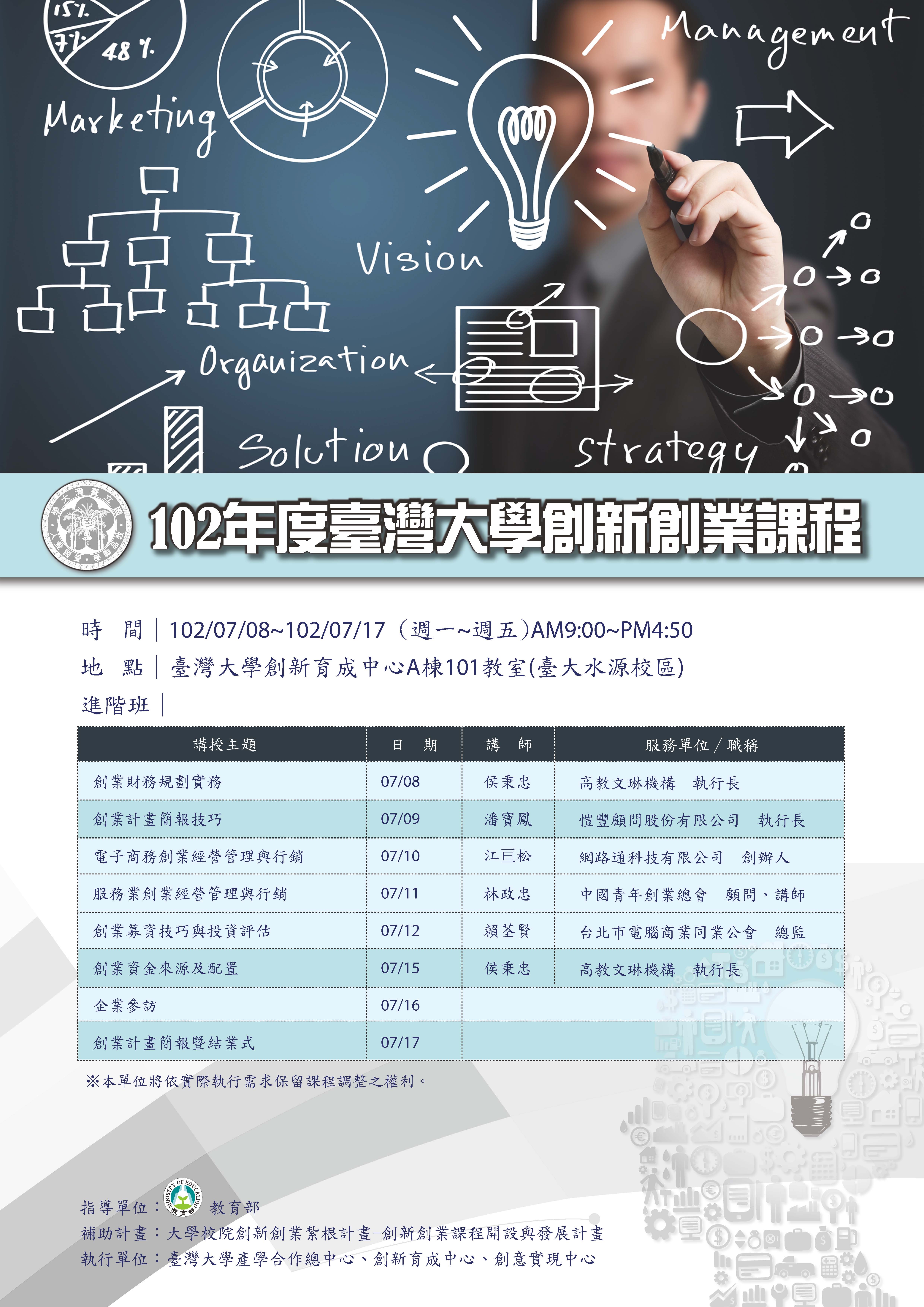 本系列「創新創業課程」分為基礎班及進階班,進階班課程以經營管理及財務兩大議題作為規劃重點,而經營管理專題則以學生創業最常見的服務業及電子商務類為主,並安排企業的參訪讓團隊親身感受將理論應用得宜的效果,最後再讓團隊透過創業計畫成果發表展現課程內化的學習成果。協助學生團隊勾勒出可實踐的創業藍圖。授課人