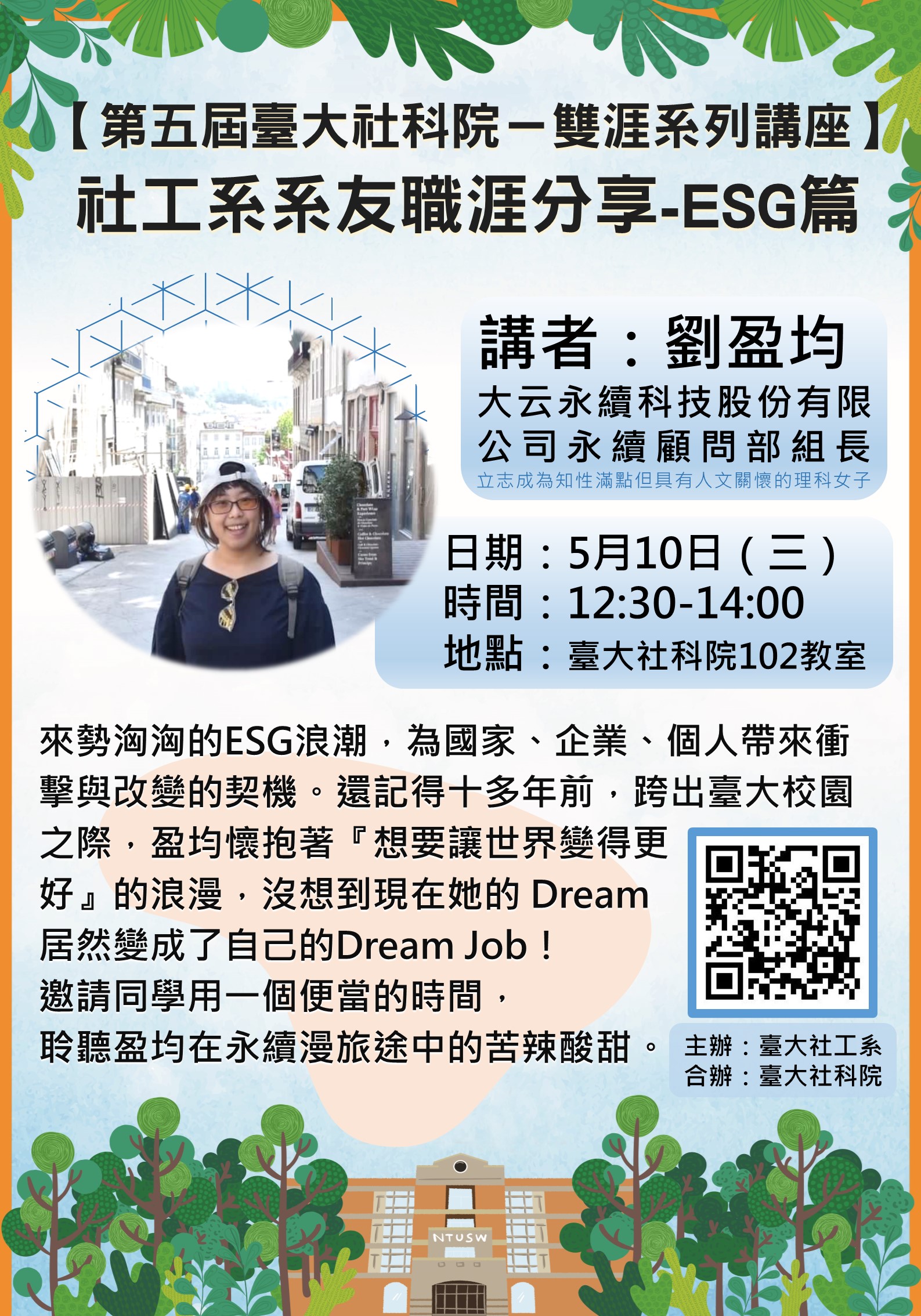 【第五屆臺大社科院-雙涯系列講座】社工系系友職涯分享-ESG篇