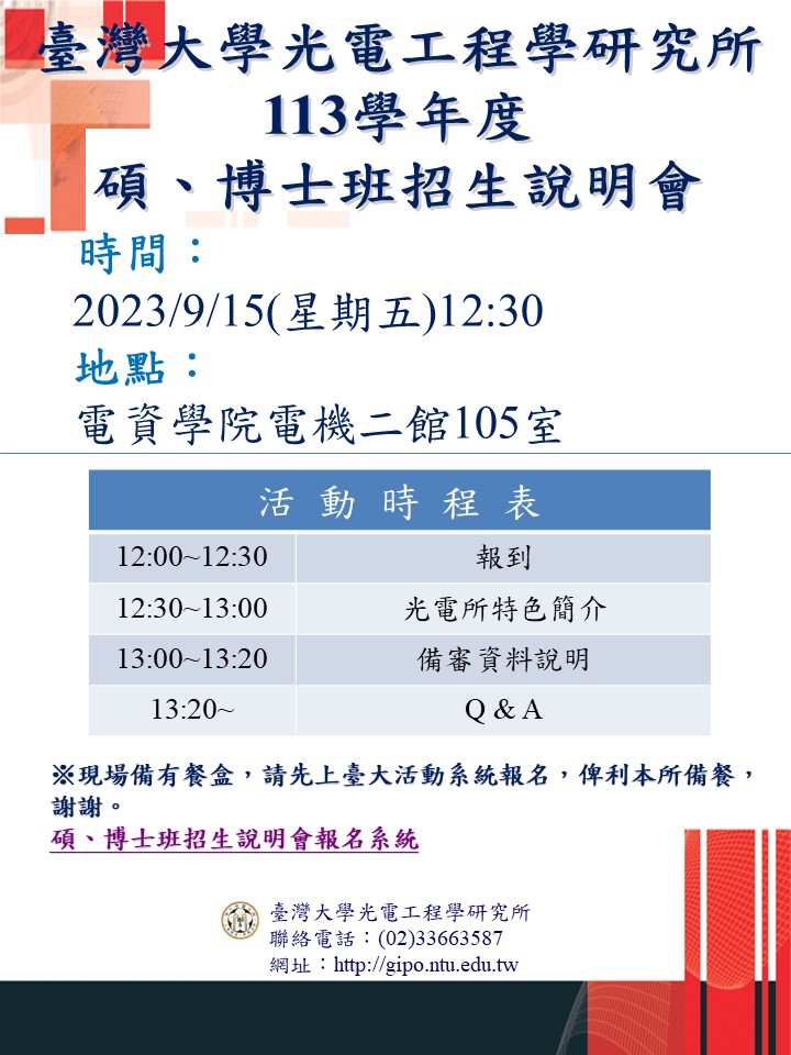 臺灣大學光電工程學研究所 113學年度 碩、博士班招生說明會場次名稱