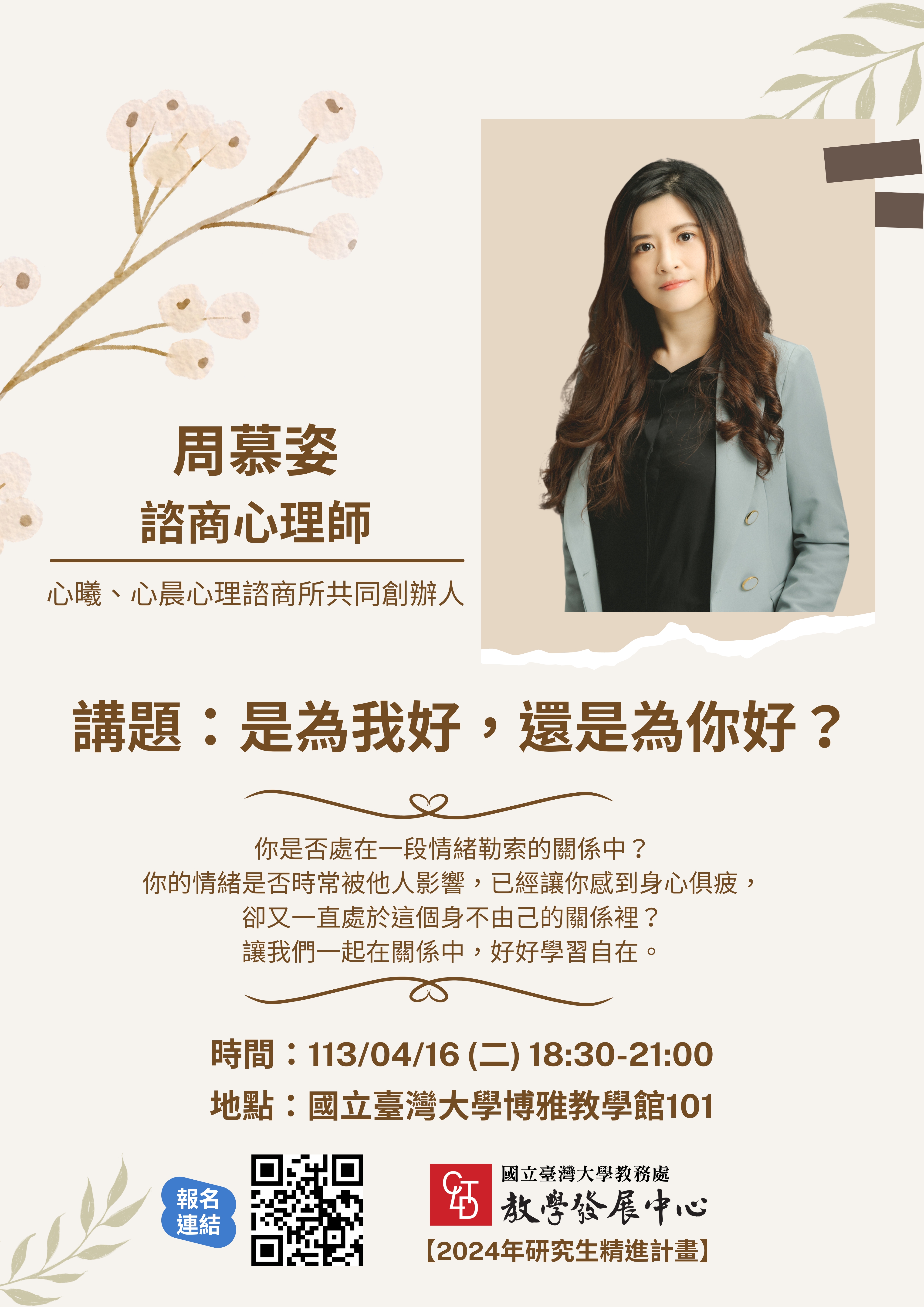講者在諮商領域有相當豐富的經驗,將透過實務經驗分享,協助研究生探索自己的情緒,並在學業之外兼顧生活身心平衡。