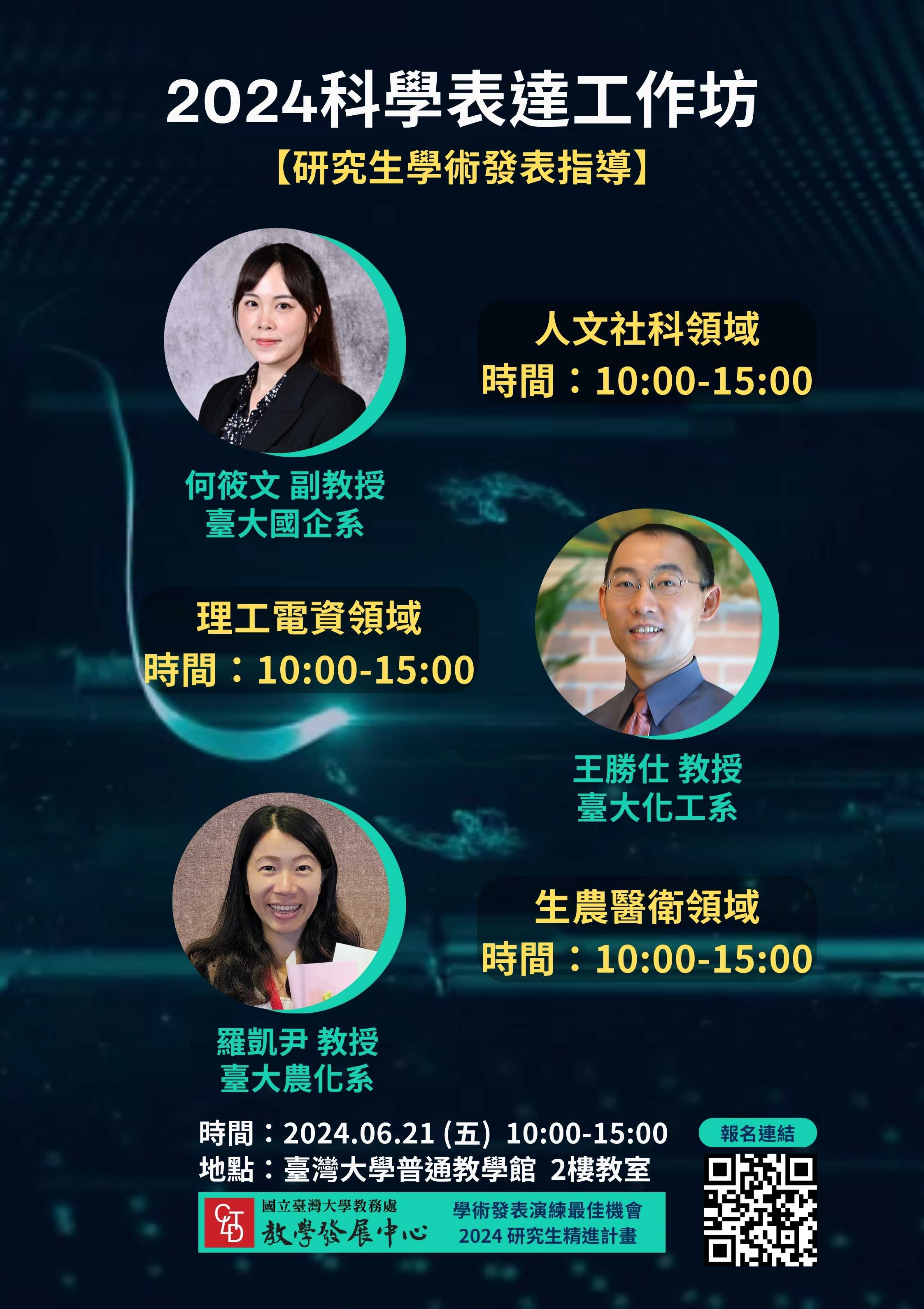 著重讓研究生進行學術發表練習,以領域分場次舉辦,透過分場講者要點提領及指導後,再向不同領域的研究生進行科學表達實作,藉由同儕觀察回饋,討論統整出表達過程中的優缺點,在逐次的分享中掌握要領,並達到向不同專業的研究者尋求合作、共同研討的跨域交流目的。